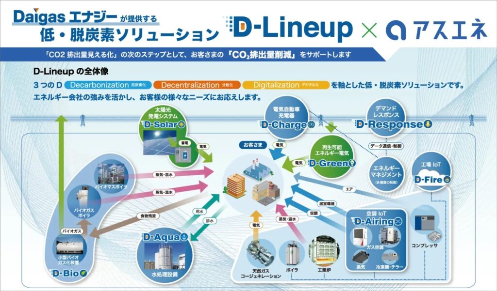 2022年8月にアスエネと業務提携し、CO2見える化から低・脱炭素ソリューションによるCO2削減までをワンストップでサポートする「D-Lineup×アスエネ」サービスを提供開始しました。