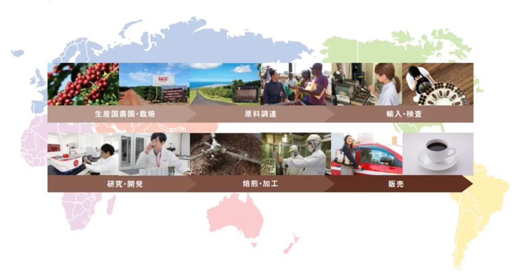 UCCグループは、コーヒーに関わる全てのバリューチェーンをグローバルに展開する企業グループです。「栽培から一杯のコーヒーに至るまで」と謳っている通り、コーヒーの製造・販売だけではなく、生産国の農地調査から苗木の栽培、品質保証や原料調達、マーケティング、研究開発、コーヒー文化の創出や教育に至るまで、コーヒーに関わるあらゆる事業を展開しています。主要製品は家庭用コーヒーの「UCCゴールドスペシャル」、「上島珈琲店」、飲料の「UCC BLACK無糖」「UCC COLD BREW」などのブランドがあります。 BtoBの事業では、コーヒーだけではなく、業務用の食材や資材の卸しなども行っています。カフェチェーンやコーヒーマシンを専門に扱っているグループ会社もあり、幅広い事業が特徴です。