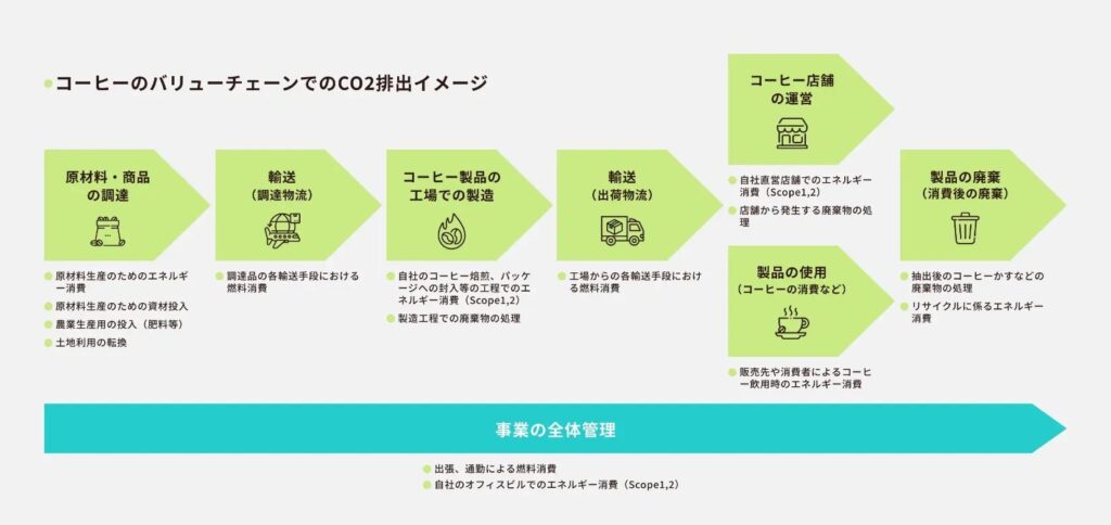当社は、2022年にサステナビリティ指針を制定し「2040年までにカーボンニュートラルの実現」という目標を掲げています。ハードルを高く掲げている目標ですが、「2030年までにスコープ1、2のCO2排出量を46%削減」という中間目標も設けることで、着実に取り組みを推進しています。広大なバリューチェーンを持つコーヒー産業においては、スコープ3の削減は大きな課題です。自社努力はもちろんのこと、ステークホルダーの方々の協力も必要不可欠です。