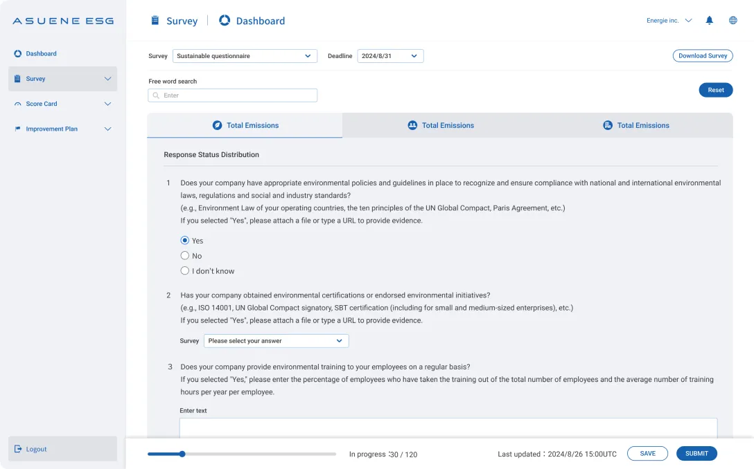 Asuene multilingual ESG experts optimize supplier data collection with e-learning and AI, reducing your ESG survey workload. Our dashboard tracks responses, automates reminders, and provides comprehensive consultant support for seamless supplier participation.