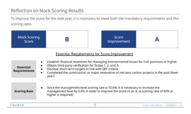 Asuene's experienced sustainability consultants enhance the accuracy of your CDP responses through mock scoring and predictive scoring simulations. We provide feedback meetings to share scoring results, identify trends, discuss improvement measures, and present re-scoring results to evaluate the effectiveness of the implemented strategies.