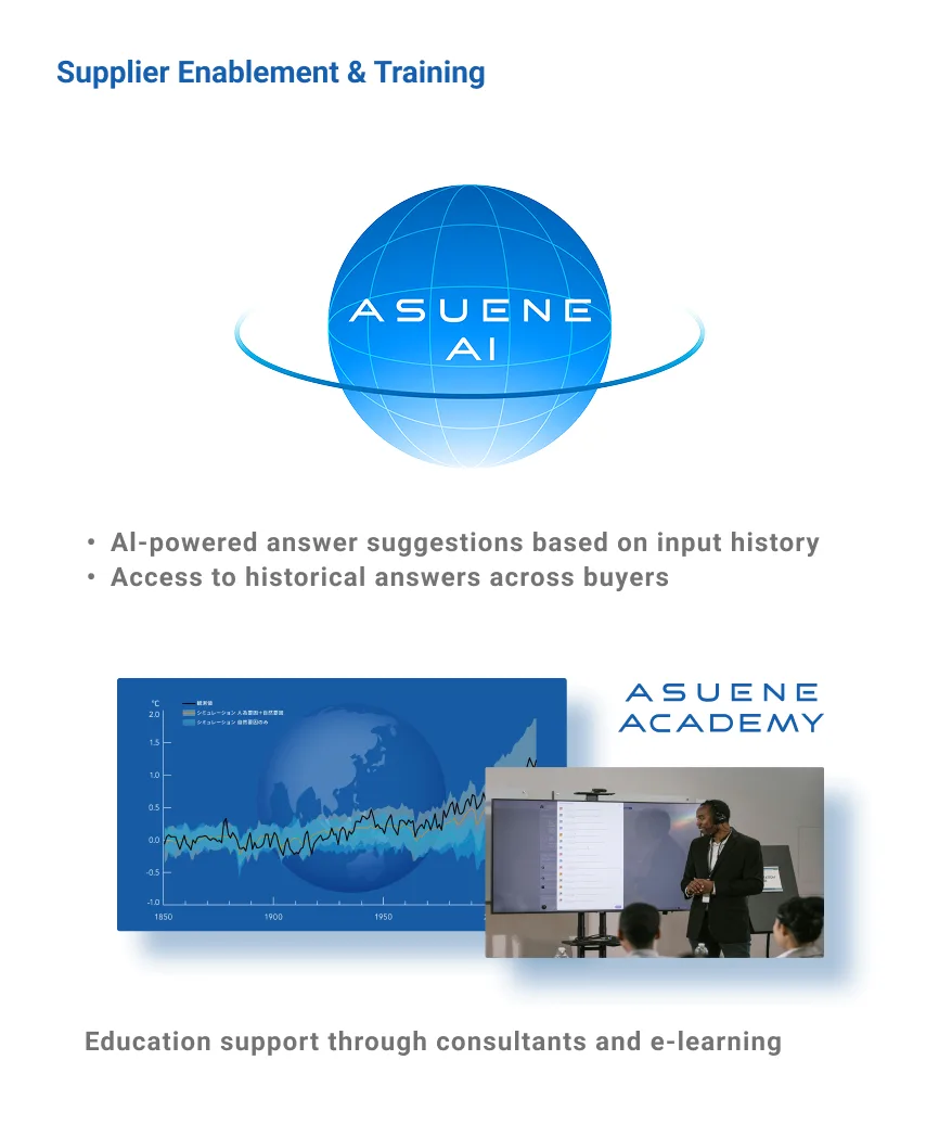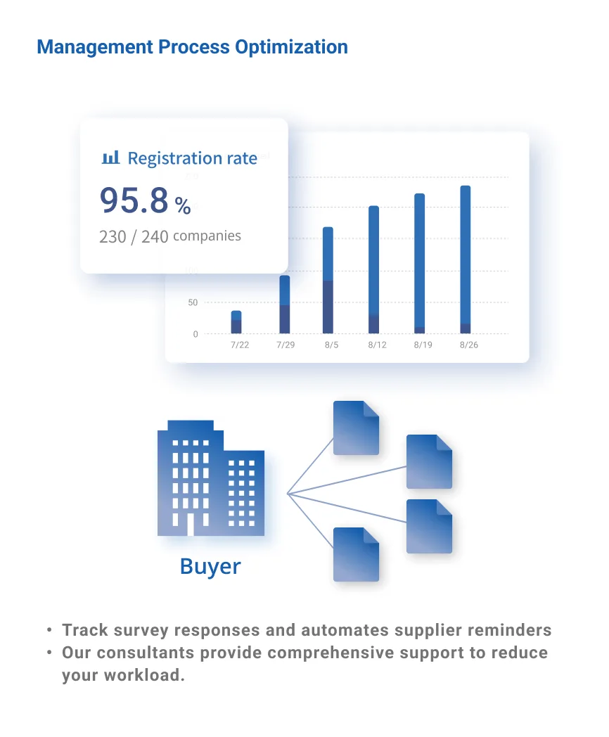 Asuene multilingual ESG experts optimize supplier data collection with e-learning and AI, reducing your ESG survey workload. Our dashboard tracks responses, automates reminders, and provides comprehensive consultant support for seamless supplier participation.