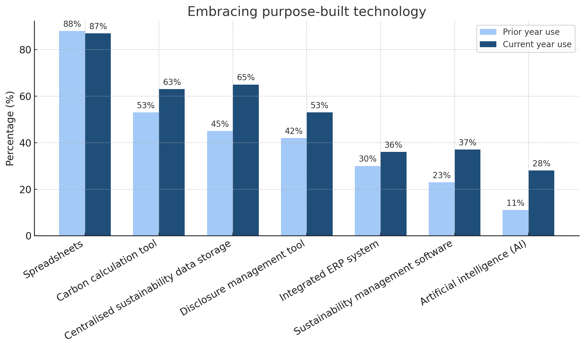 The PwC survey also illustrates this trend clearly. While spreadsheets remain widely used, the adoption of specialized tools such as carbon calculation platforms, disclosure management software, and AI-driven solutions has accelerated year over year.