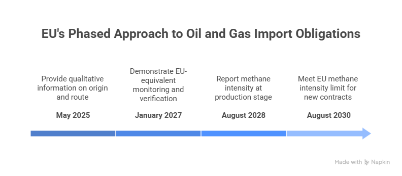 Importantly, the regulation extends beyond EU borders. By covering imported oil and gas, the EU aims to avoid carbon leakage and ensure that climate ambition within the bloc is not undermined by higher emissions embedded in imports. For exporters, this means that upstream emissions data is becoming part of market access requirements, alongside price, volume, and reliability.