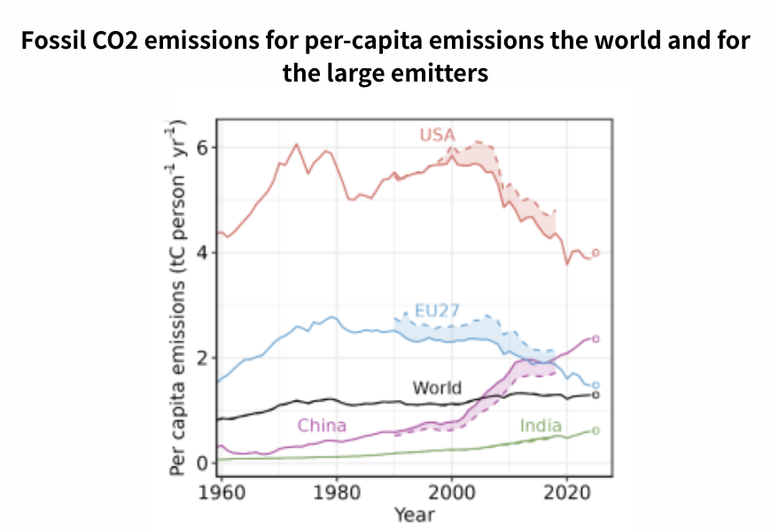 A blue toned chart of per capita emissions in the report provides visual clarity on how these two countries compare with the United States and the European Union. The data show that while total emissions remain high due to population and industrial scale, the intensity of emissions growth is slowing.