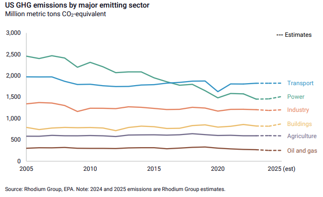 At a sector level, transportation remains the largest source of emissions, though growth there has slowed due to vehicle efficiency gains and the continued adoption of hybrid and electric vehicles. The more notable changes occurred in the power and buildings sectors, where emissions rose sharply due to increased energy demand and higher fossil fuel use.