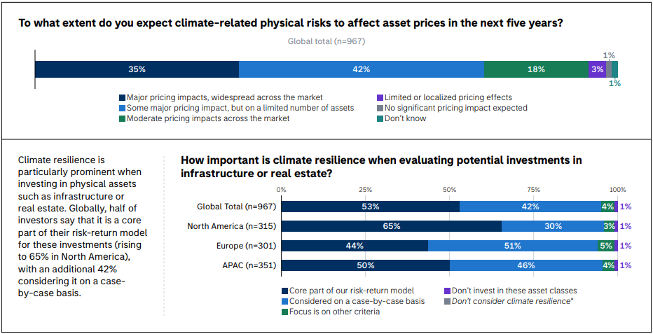 Physical climate risks are increasingly perceived as material and time sensitive by the global investment community. More than 75 percent of surveyed respondents expect physical risks to have a major impact on asset prices within the next five years. Thirty five percent anticipate widespread impacts across markets, while another 42 percent expect significant effects on a subset of assets. These expectations show a steadily rising concern about the direct financial implications of climate related events. Sectors with substantial exposure to physical infrastructure, such as real estate, transportation and energy systems, are particularly affected. Half of investors globally indicate that climate resilience is a core component of their risk return model when evaluating physical asset investments.