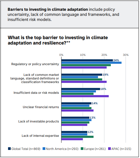 Despite the rising interest in climate adaptation, several structural challenges continue to hinder significant capital flows toward adaptation related solutions. Policy uncertainty remains the most frequently cited barrier, reflecting the difficulty investors face when long term regulatory commitments are unclear or inconsistent across jurisdictions. A lack of common classification frameworks and standard definitions further complicates investment decisions, as investors struggle to compare potential solutions or evaluate their effectiveness. Insufficient data and underdeveloped risk models represent another significant constraint, as accurate assessments of adaptation outcomes require granular, location specific climate projections and methodologies that remain in early stages.