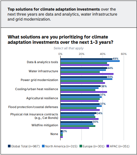 The rise of adaptation as a leading investment priority is reshaping expectations for corporate climate strategy. Companies that proactively address physical climate risks are better positioned to attract capital, maintain operational stability and align with evolving investor criteria. Adaptation related solutions gaining momentum include data and analytics tools, water infrastructure improvements, power grid modernization, cooling and heat resilience strategies and agricultural resilience technologies. These solutions reflect a blend of digital innovation, infrastructure enhancement and sector specific protective measures.