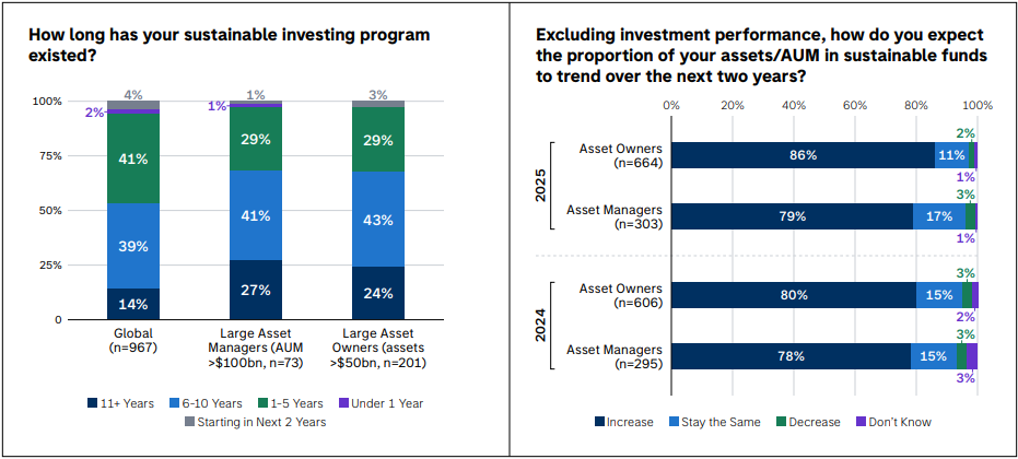 Over the past year, institutional investors strengthened their commitment to sustainable investing, with a significant majority planning to increase allocations to sustainability focused strategies. According to the survey, 86 percent of asset owners expect the proportion of their sustainable fund holdings to rise over the next two years, and 79 percent of asset managers expect sustainable AUM to grow. These expectations remain consistent across asset sizes, suggesting that the momentum for sustainability integration continues to accelerate. This trend aligns with the long standing maturity of sustainable investing programs, as nearly all surveyed institutions have actively practiced or planned to practice sustainable investing for at least one year.