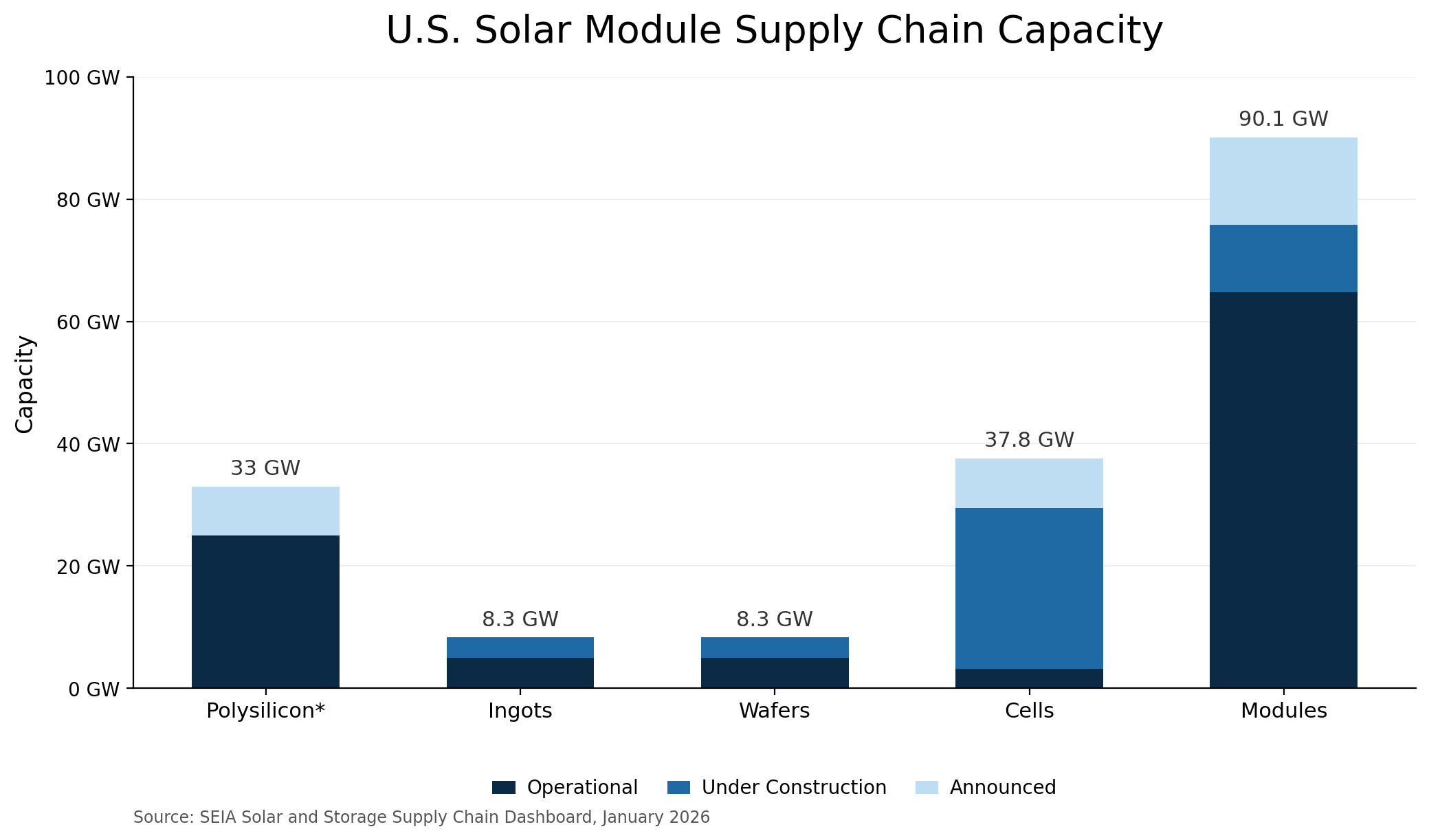 The latest data points to substantial and broad based growth in US solar manufacturing capacity. New figures from the Solar Energy Industries Association show that the entire solar supply chain has effectively been reshored, with manufacturing capacity expanding across every major segment of the solar and storage value chain since the end of 2024.