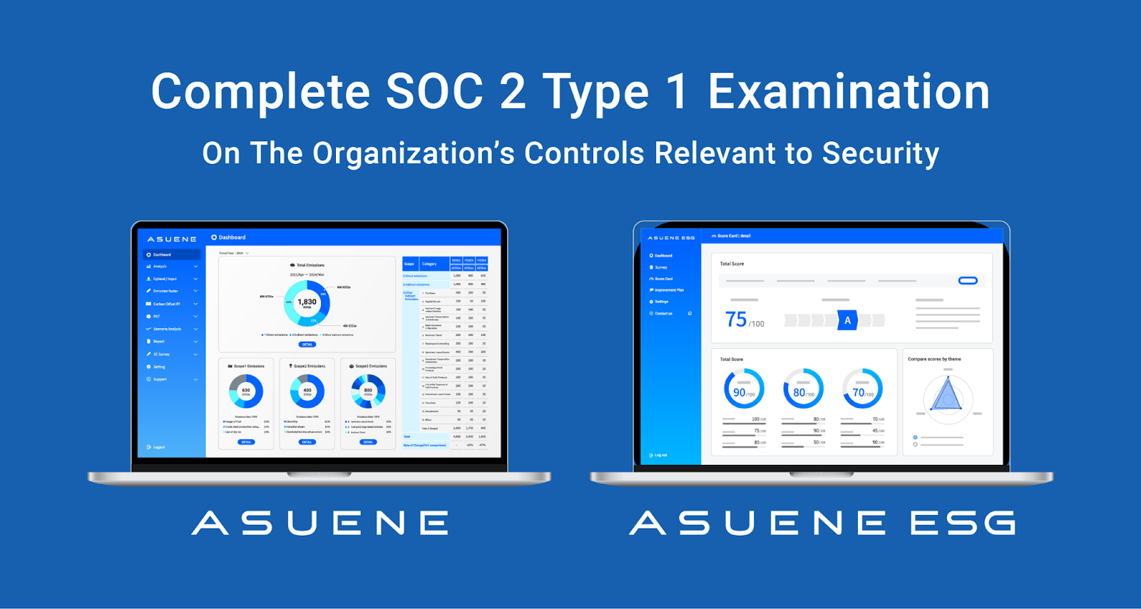 This examination assesses the effectiveness of internal controls related to security and privacy protection in accordance with international standards. With this achievement, companies using ASUENE’s services can be assured that their ESG data and customer information are managed in line with globally recognized security standards. The SOC 2 Type 1 report also helps streamline both internal and external audit processes, particularly around internal control evaluations.